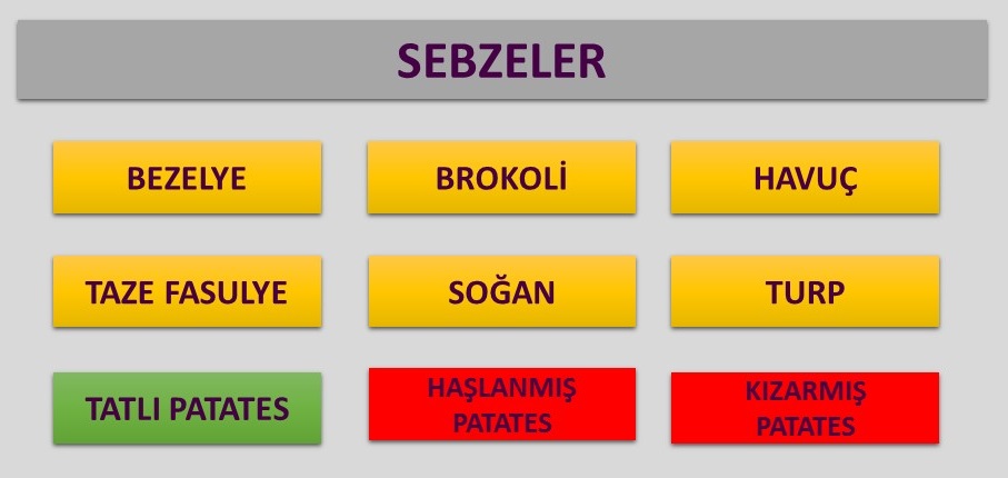 Tabloda kırmızılar yüksek, yeşiller orta, sarılar düşük glisemik indeksli besinleri göstermektedir.
